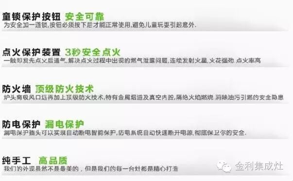 金利集成灶拥有燃气功能熄火保护装置,防触电保护系统、漏气防护系统,在使用过程中,燃烧器因溢汤等原因,使炉火熄灭,熄火保护装置瞬间启动,自动切断气源,让您厨房烹饪变得安安心心。