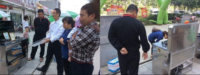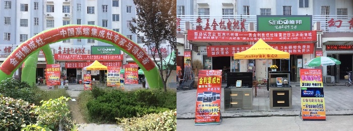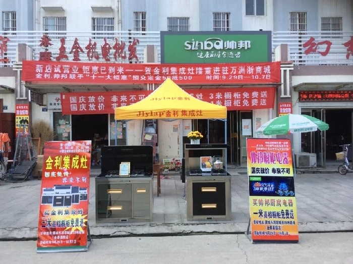 国庆期间金利专卖店由于正在加班装修中,孔总在枣庄当地最聚人气建材街道搭建起了户外展销平台,让金利集成灶提前亮相枣庄。此次活动为了吸引更多消费者。孔总深知现代厨房装修集成灶与橱柜配套需求,制定了买集成灶送橱柜优惠方案。并且现场演示金利集成灶神奇的油烟吸附能力让消费切实感受到金利集成灶所带来的无烟、健康、环保舒适生活。活动刚开始就迅速的引来不少来往人群驻足观望或者详细了解金利集成灶的工作原理,产品结构、售后服务等各方面疑问。不少消费者见识金利集成灶神奇油烟吸附能力不经拍手叫好,更有多位顾客现场预定。