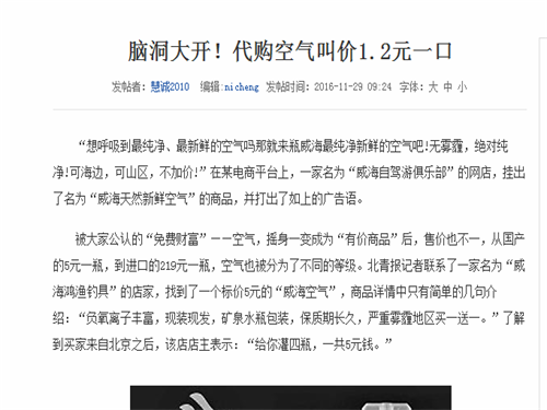 现如今,跨境电商、海淘客、国内保税区、境外代购、旅游购物等多种海外购物的形式,不断地改变着中国人的传统消费习惯。近日小编在网络热点看到一遍报道:”代购空气1.2元一口“。“想呼吸到最纯净、最新鲜的空气吗?那就来瓶威海最纯净新鲜的空气吧!无雾霾,绝对纯净!可海边,可山区,不加价!”在某电商平台上,挂出了名为“威海天然新鲜空气”的商品,并打出了如上的广告语。售价也不一,从国产的5元一瓶,到进口的219元一瓶,空气也被分为了不同的等级。看了这篇报道让小编尤为惊叹,海购都已经发展成为可以代购空气啦?