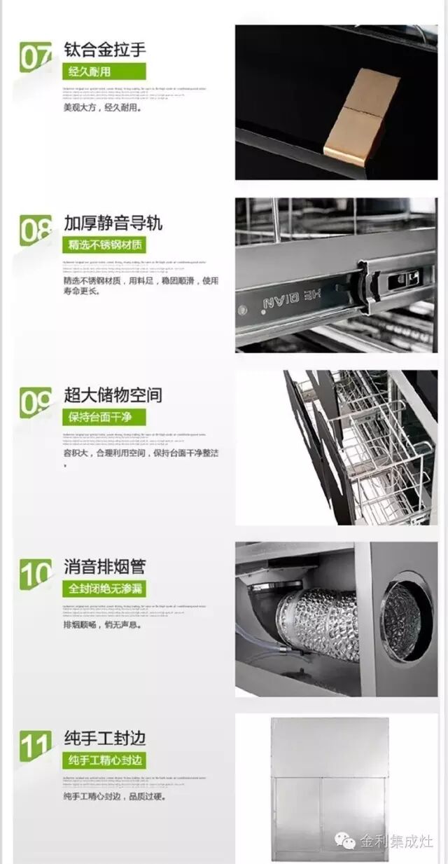 将吸油烟机、燃气灶、消毒柜、储藏柜、微晶灶、电磁炉等功能完美地融合为一体,具有独特的组合式和高效率的吸油烟效果,实现各项功能地最大化使用效率,全自动化地智能控制,真正实现人们追求绿色环保型高档厨房电器产品的要求。