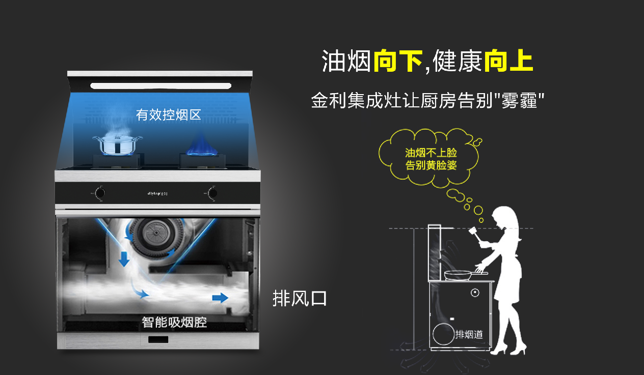 /index.php?upcache=1”,运用微空气动力学原理,油烟吸净率高99.96%,金利集成灶还有自己的专利油烟分离离心装置,高速旋转的不锈钢轮片,可以非常高效地通过离心力将细微的油滴甩到导油板上,实现收集。使油烟吸排更高效、更洁净,彻底解决油烟困扰,打造无烟健康厨房环境。