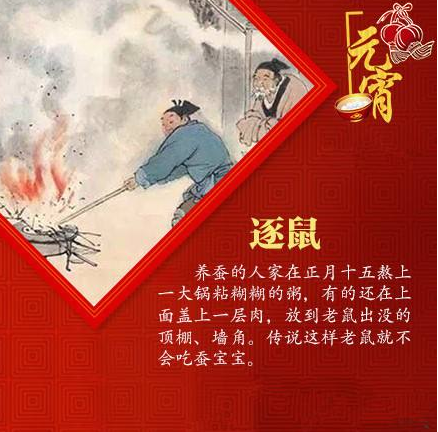 这项活动主要是对养蚕人家所说的。因为老鼠常在夜里把蚕大片大片地吃掉,人们听说正月十五用米粥喂老鼠,它就可以不吃蚕了。于是,这些人家在正月十五熬上一大锅粘糊糊的粥,有的还在上面盖上一层肉,将粥用碗盛好,放到老鼠出没的顶棚、墙角、边放嘴里还边念念有词,诅咒老鼠再吃蚕宝宝就不得好死。