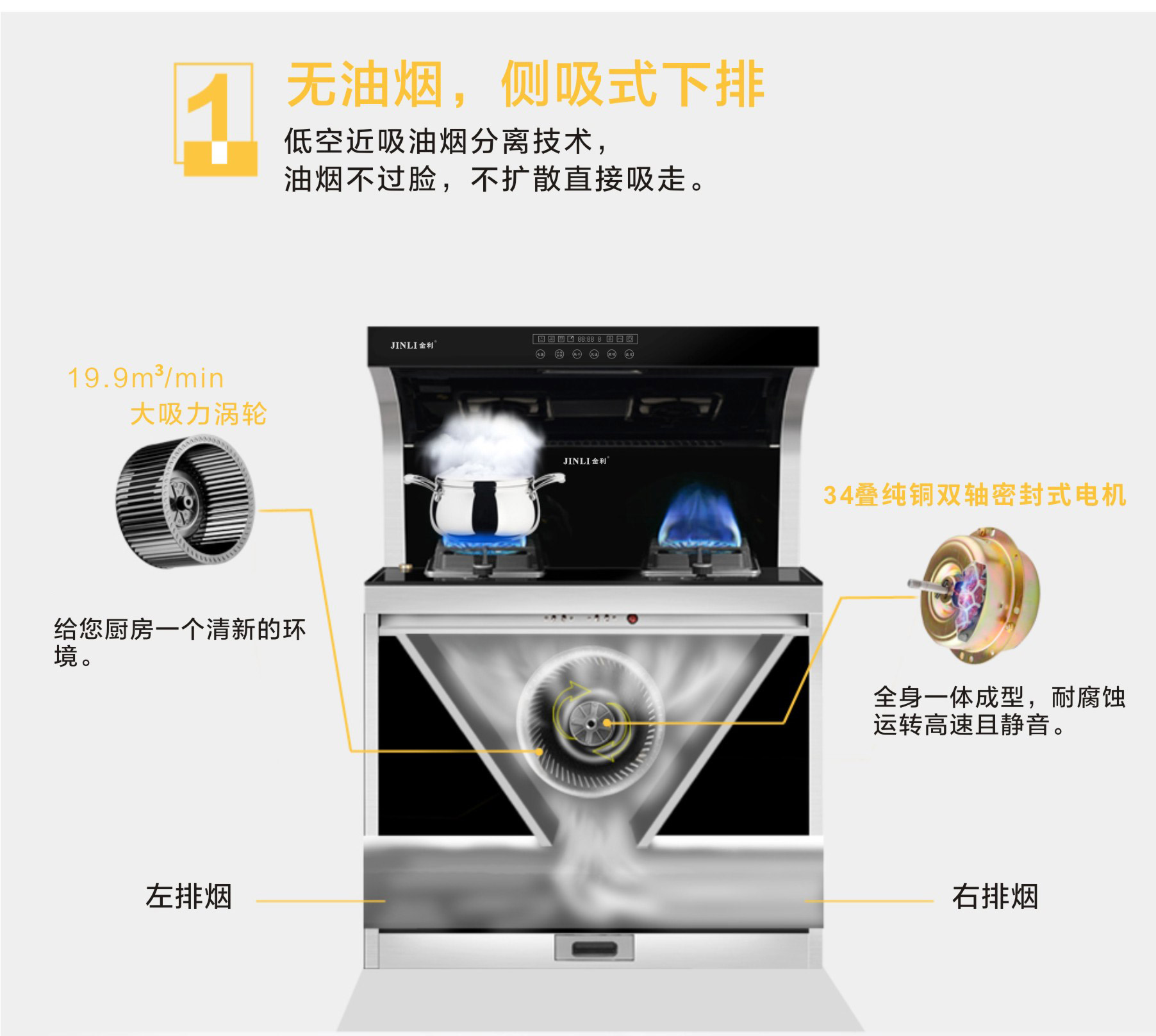 金利 集成灶最大的两个特点是高效的油烟净化率和大幅度优化占用空间。通过侧吸下排,快速聚拢油烟后排出,不扩散,不跑烟,油烟净化率超过99.96%,长期使用无油渍残留;而集成了多种功能后,为狭小的厨房节省了许多空间,可以添置更多电器,更好的搭配厨房!现代消费者生活节奏加快,金利集成灶通过高效吸油烟,减轻清洗的苦恼,这是消费者非常看中的一点。