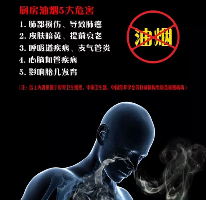 最表面的就是衣服上、头发上沾染难闻的油烟味,当在通风系统差的厨房、燃烧效能极低的炊具上做饭,准备一餐时所吸入的DNP是室外新鲜空气中的188倍,等于每天吸两包烟,对健康造成了损害。而且用油量越大,火势越猛,翻炒越频繁,产生的油烟特别多,经常呛得眼泪直流,要知道烟雾对呼吸道刺激可引起咳嗽、咳痰、刺激眼睛引起流泪、结膜炎等。长时间吸入油烟人体组织发生病变,不仅如此,油烟附在皮肤上,会影响皮肤的正常呼吸,时间一久,皮肤就会变得松弛无弹性、布满皱纹、灰暗又粗糙、长斑,油烟可损伤体内免疫系统,还会造成不同程度脱发,且在长期在厨房操作,诱发各种疾病。油烟的脂肪氧化物会引发心血管、脑血管疾病,尤其是老年人更容易患心脑血管疾病,还会导致哮喘恶化,从而增加患肺癌的机会。根据资料100个患者中就有80%的就是长期在厨房操作。油烟对儿童的危害更为巨大 ,本来小孩子们抵抗力差,比较容易生病,且少年儿童都是在长身体的阶段,油烟会严重危害孩子的健康成长发育。最后一点炒菜一段时间后,油烟会四处蔓延,油烟凝聚在厨房厨具、墙壁,时间一久又很难清洗,所以治理厨房油烟问题迫在眉睫。