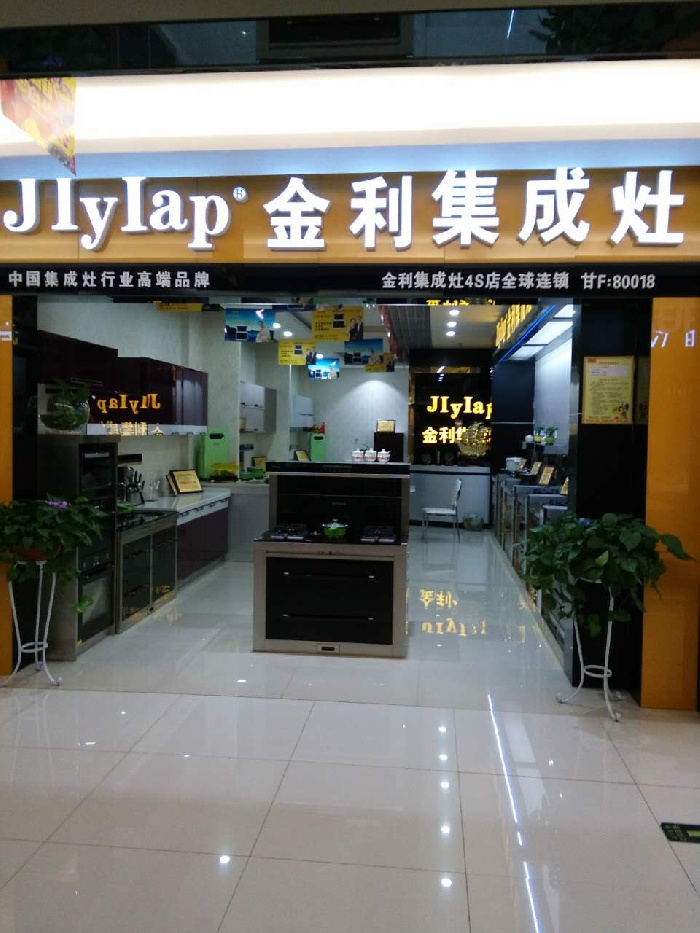 金利集成灶甘肃酒泉旗舰店,高端大气的产品展示,统一的品牌形象LOGO,为酒泉市的市民提供优质的厨房电器,一站式贴心服务,真正体现有情、有意、有金利的企业宗旨。