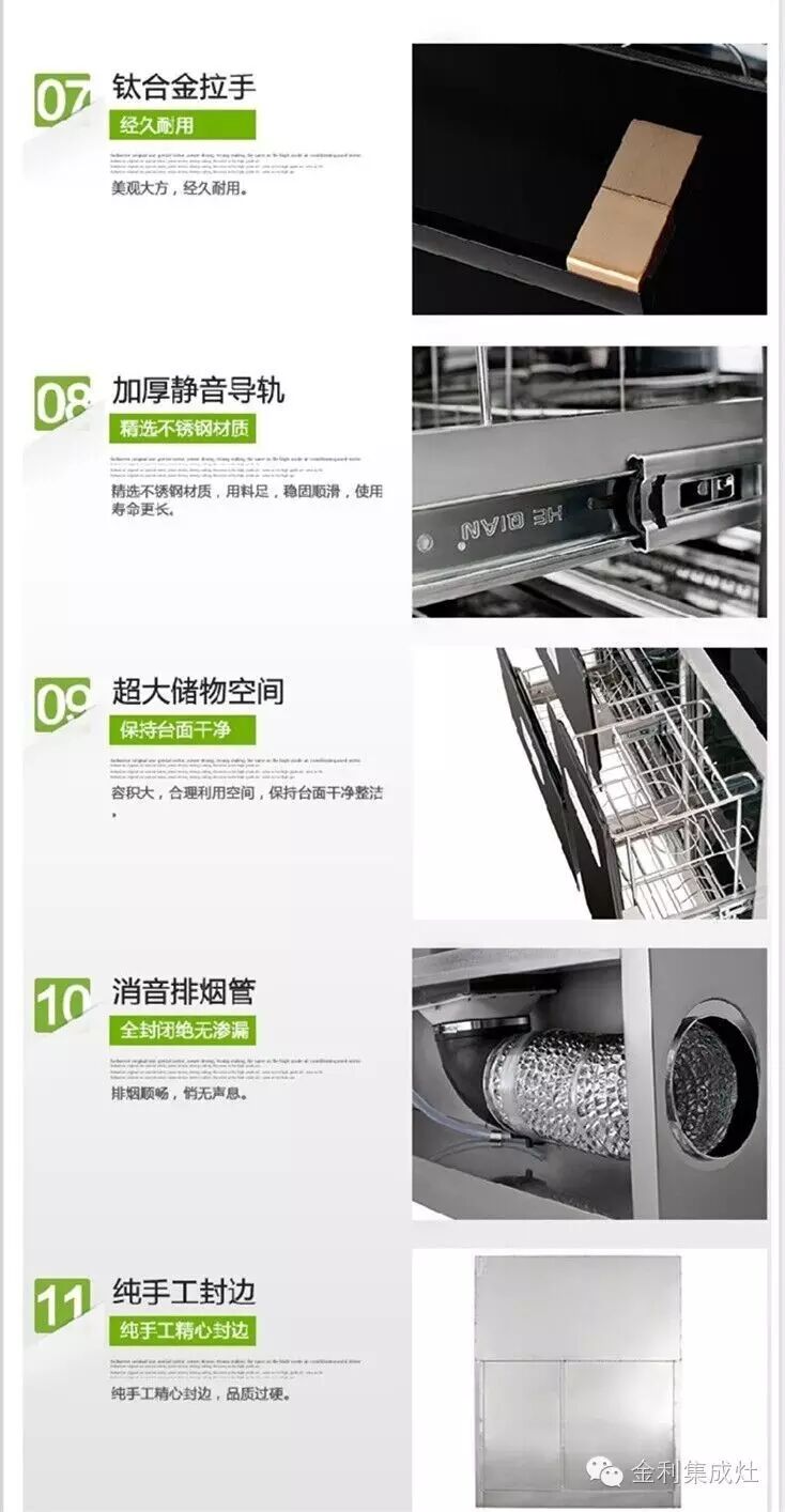 金利集成灶集成了油烟机、灶具、消毒柜、贮藏柜的功能,更方便省心。